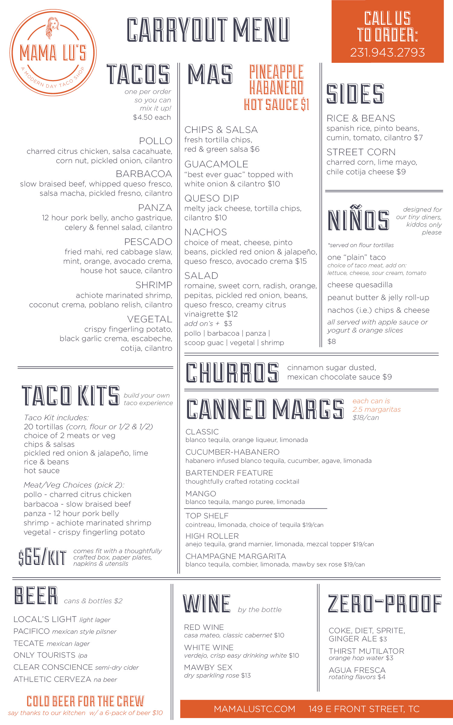 Give us a call at 231.943.2793 to place your order! You can also order Mama Lu's via DoorDash (delivery and pickup).